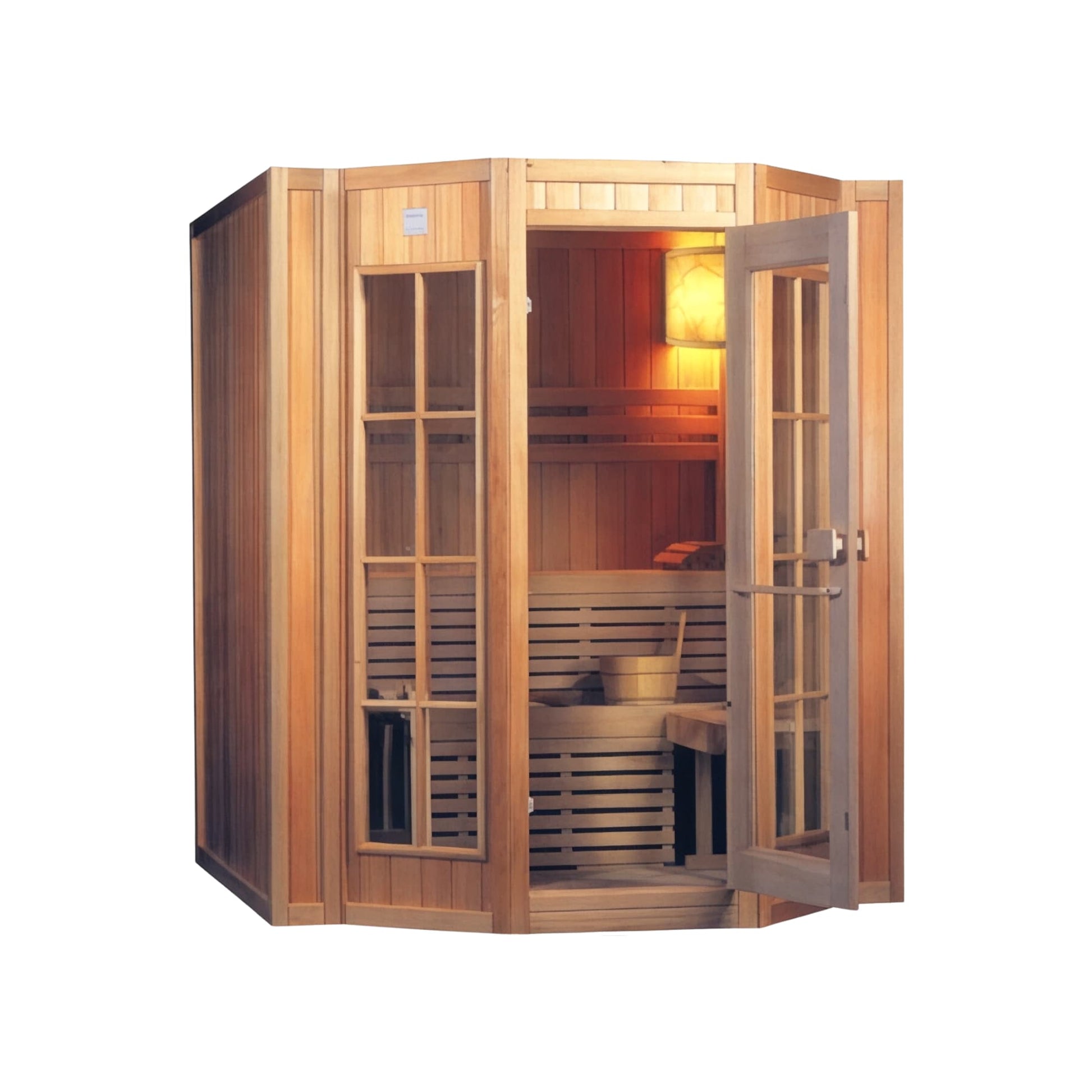 - Accessories Included: Hygro-thermometer, wooden bucket & ladle, safe sauna lamp